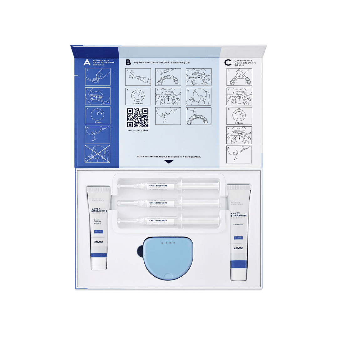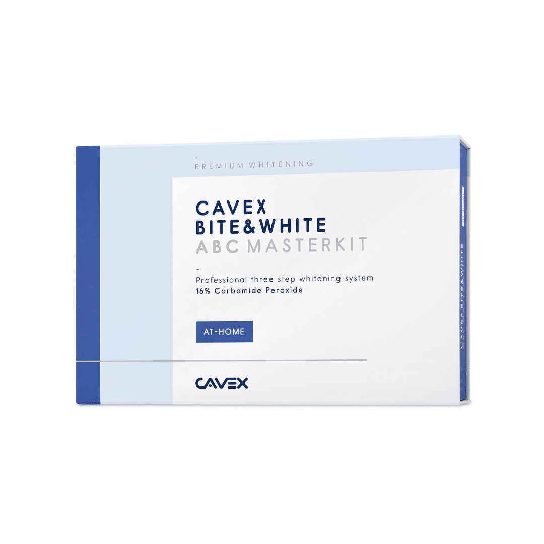 El gel blanqueador, aplicado en una cubeta, contiene peróxido de carbamida al 16 % que equivale a peróxido de hidrógeno al 6 %. El fluoruro de sodio añadido refuerza el esmalte y el nitrato de potasio minimiza cualquier sensibilidad. - C – ACONDICIONAR con Cavex Bite&White ExSense (5-10 minutos ).