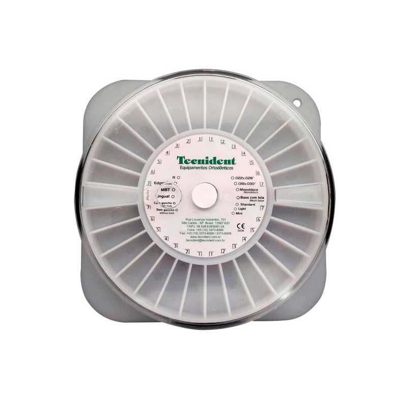 La caja circular de brackets de Tecnident es una caja organizadora diseñada para guardar brackets y tubos de manera específica para cada pieza dental. Sus compartimientos numerados otorga mayor organización mediante la fácil identificación de su contenido. Su mecanismo de rueda permite girar la tapa hasta llegar al compartimiento seleccionado mientras que resguarda el resto de los brackets y tubos en sus compartimientos cerrados. Disponible en dos formatos de distinto tamaño: para 5 y 20 casos.