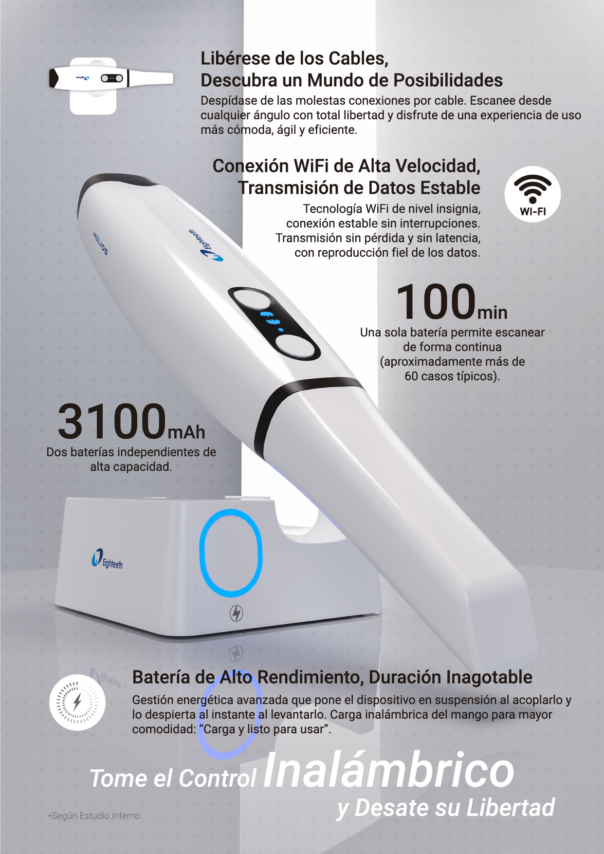 - Sistema de doble batería de 3100 mAh que permite hasta 100 minutos de uso continuo (equivalente a más de 60 casos estándar), con carga directa desde la base inalámbrica.