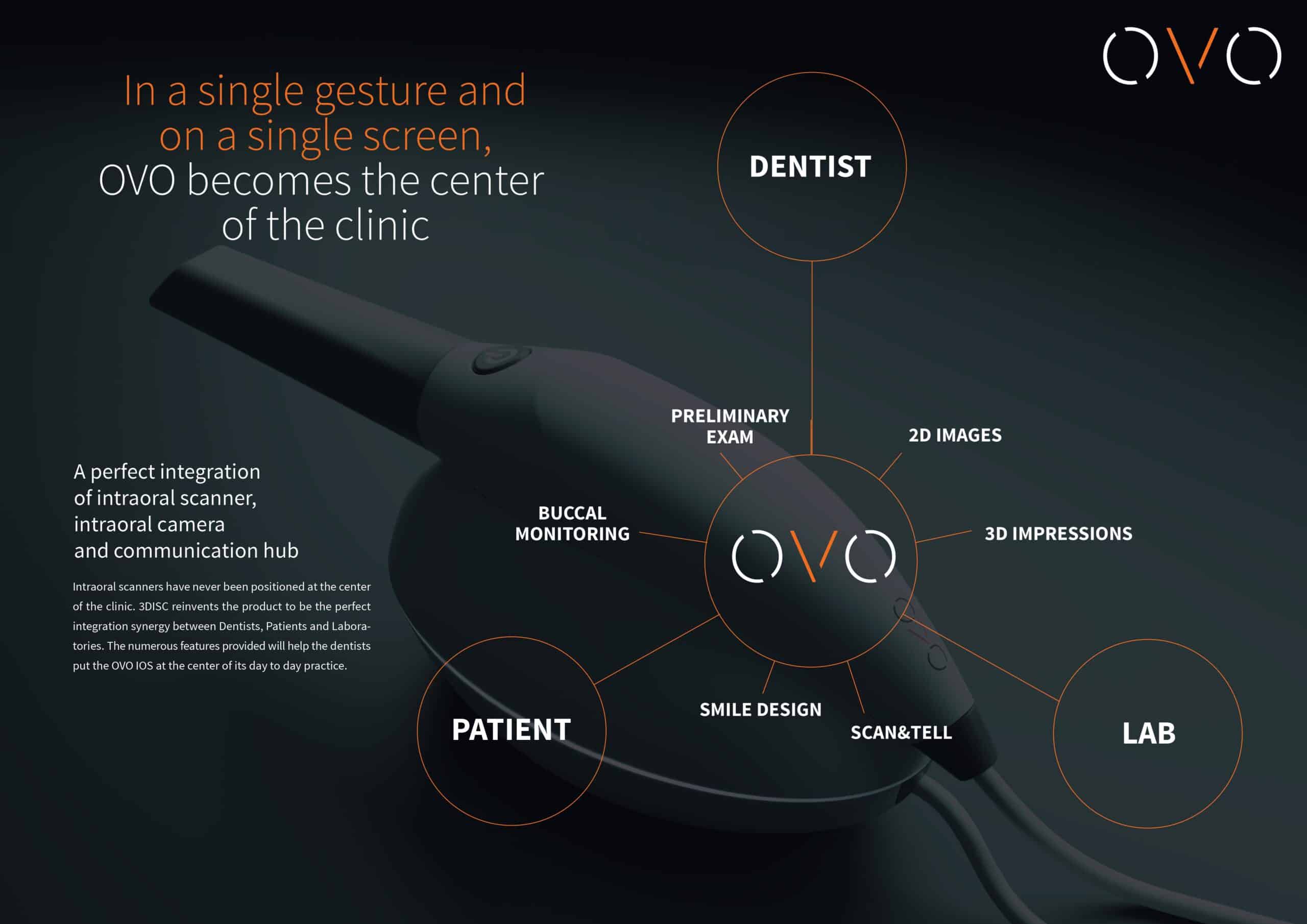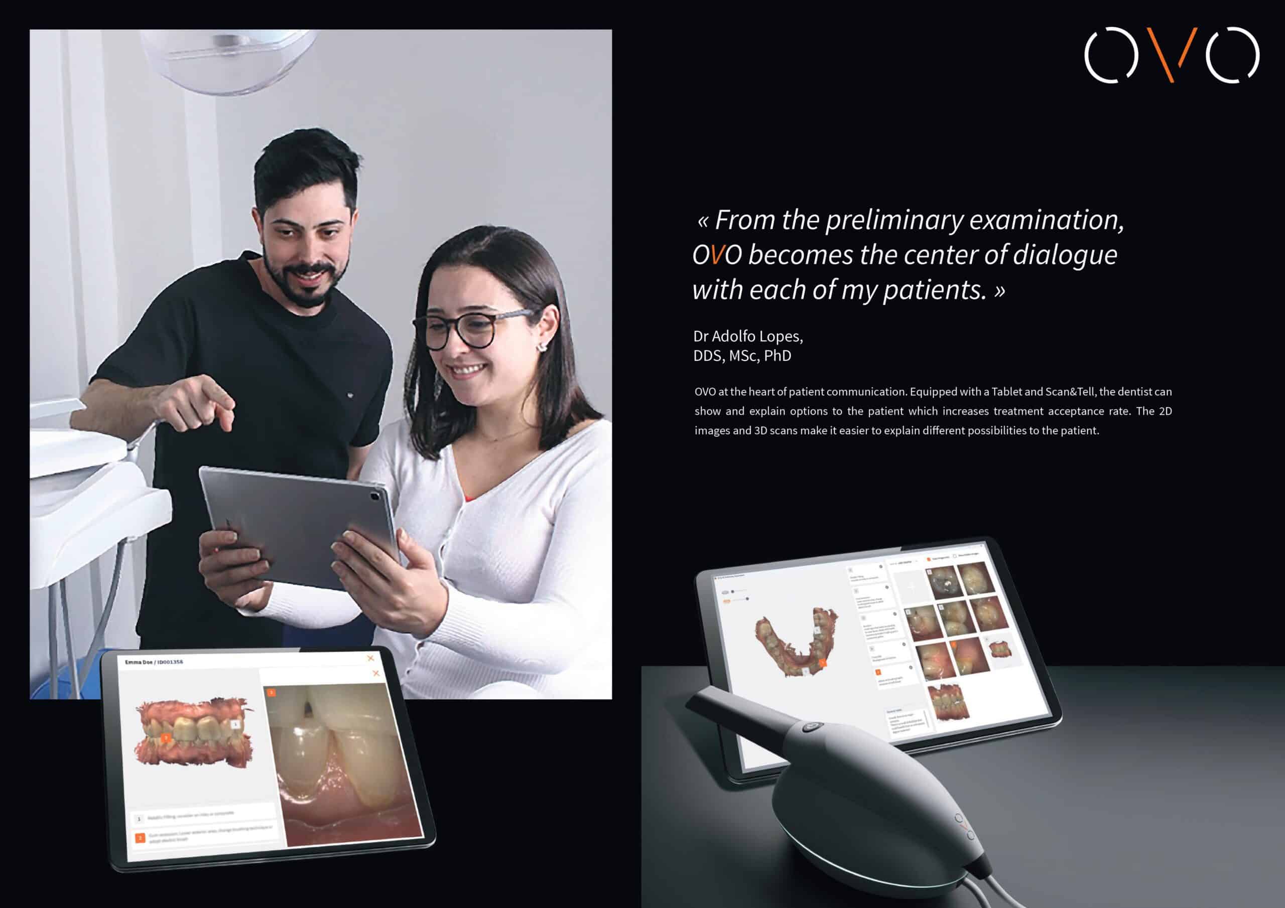 - Fácil Uso: OVO integra perfectamente el scanner intraoral, la cámara intraoral y el centro de comunicación. Desde el examen preliminar, OVO se convierte en el eje central del diálogo con cada paciente. Con el software Scan&Tell, el dentista puede mostrar y explicar las opciones al paciente, aumentando la tasa de aceptación del tratamiento. Las imágenes 2D y los escaneos 3D también facilitan la explicación de los diferentes tratamientos.