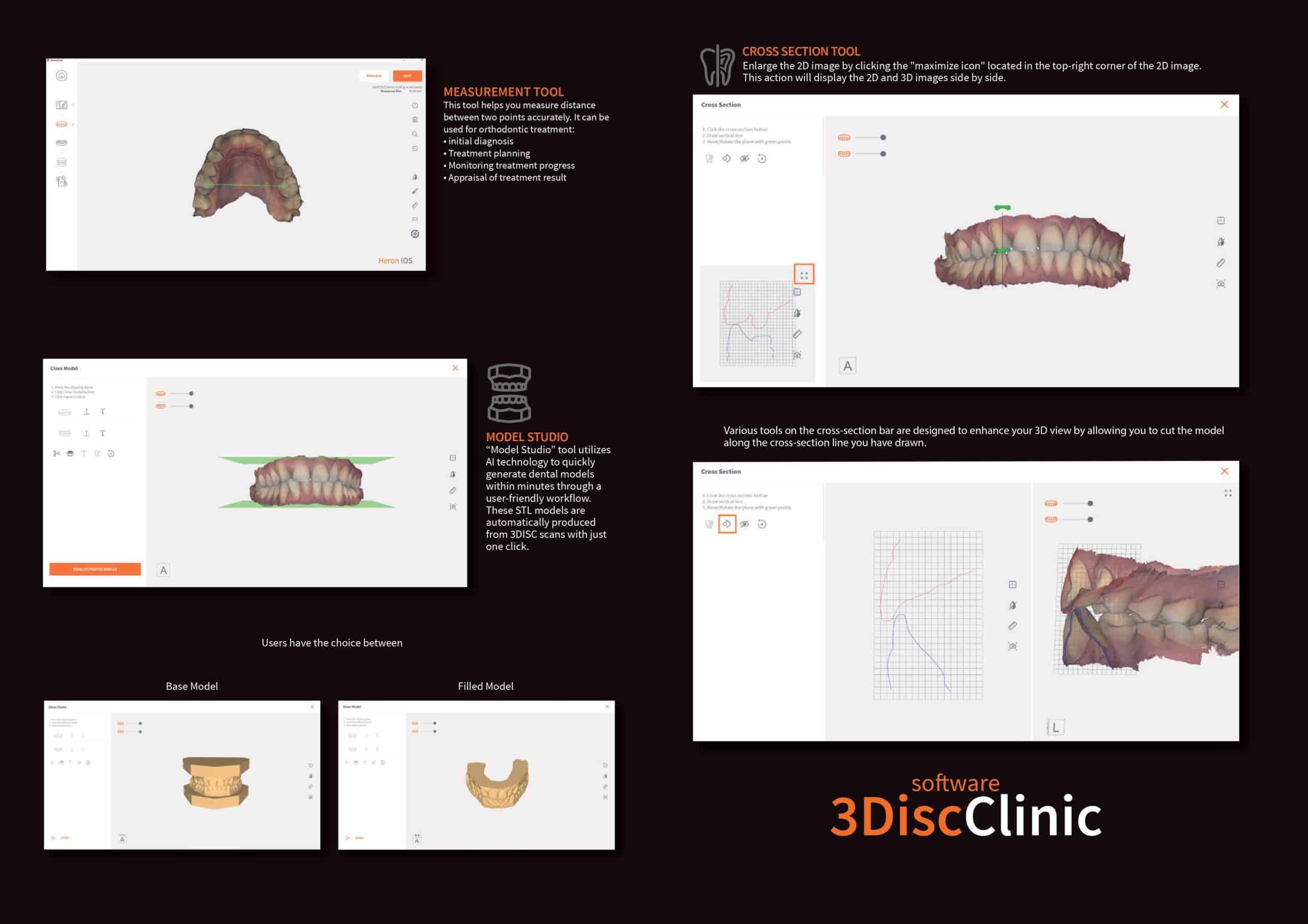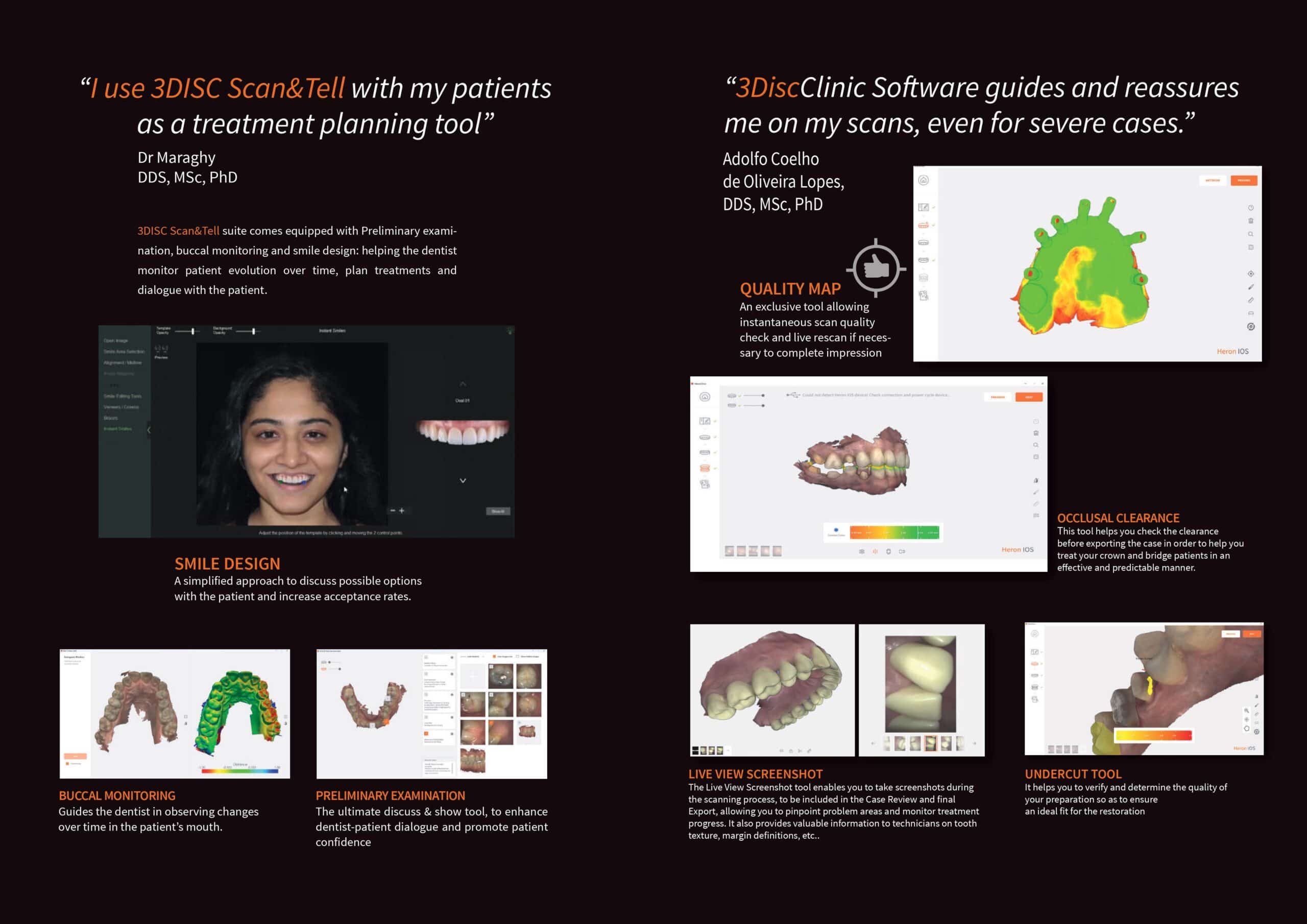 La suite 3DISC Scan&Tell viene equipada con examen preliminar, monitorización bucal y diseño de sonrisa: ayudando al dentista monitorear la evolución del paciente a lo largo del tiempo, planificar tratamientos y Diálogo con el paciente. Un enfoque simplificado para discutir posibles opciones con el paciente y aumentar las tasas de aceptación.