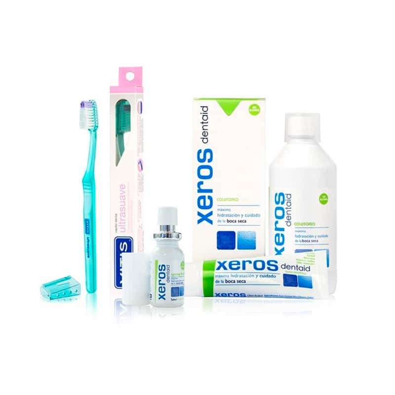 - Enjuague Xeros Dentaid® 500ml: se usa tras el cepillado, permite aliviar la sensación de boca seca y humectar la cavidad bucal. Ayuda a eliminar restos de alimentos y mantiene la boca lubricada. Además, previene la aparición de caries y mal aliento, a la vez que ayuda a reforzar el esmalte dental, sin irritar la mucosa oral.