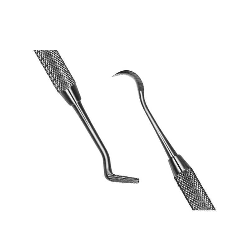 Instrumento de 2 puntas para adaptar bandas y limpiar exceso de cemento. El lado del adaptador de banda es dentada en sus cuatro lados y final de la punta.